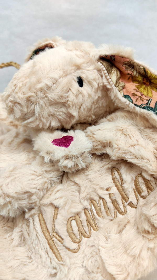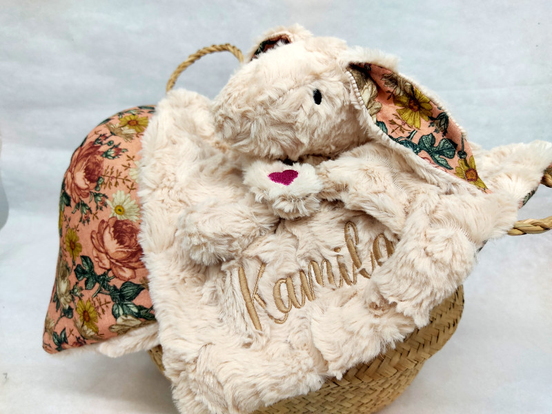 Poza tym każdy prezent powinien mieć coś co go wyróżnia, u mnie jest to haft personalizacja. Haft sprawia, że kocyk przytulanka jaką jest królik jest wyjątkowym i oryginalnym pomysłem na prezent. Imię dziecka haftuję na jednolitej stronie kocyka. Do tego wybrałam duży, pisany font, który idealnie współgra z całością.